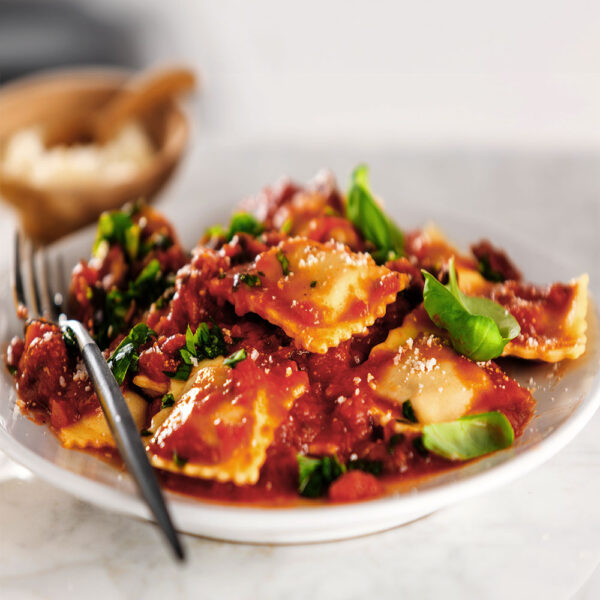 Homemade egg pasta with filling in tomato sauce Spinach and Ricotta Filling(option without Parmesan)
